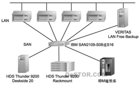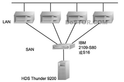 如前所述,原环境中已存在一些网络设备,在构建SAN时增加一台光纤通道交换机和一台光纤通道磁盘阵列。由于用户的应用需要不同平台的多台主机共享数据,所以还要配以文件共享软件和网络文件系统转换的软件。本方案采用HDS 公司的Thunder 9200 和IBM 公司光纤交换机2109-S08 或S16 组建存储区域网络,其拓扑结构如图 10-1 所示。