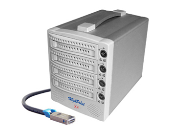 HighPoint的产品X4,是一款Multi-Port Infiniband 到Serial ATA 2.0/1.0外置硬盘模组。支持4个SATA2.0/1.0硬盘,并且支持苹果机Mac G5系统。