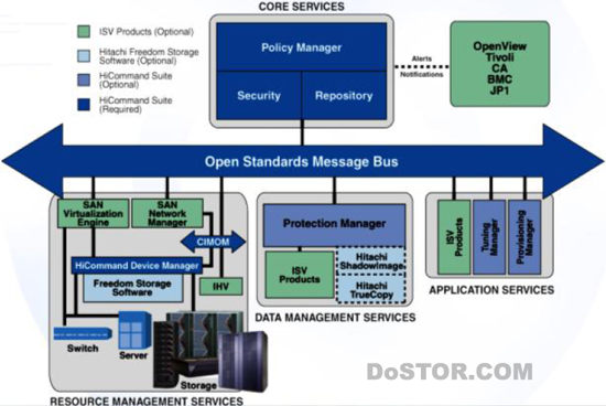 HiCommand 设备管理软件为企业提供了一个统一的管理平台,可以实现集中式的管理多个异构的存储系统。它可以从主机、应用和存储系统等方面对存储资源进行管理,可以提高存储系统管理员的工作效率,联机的动态的对存储资源进行管理。目前,通过Hicommand设备管理软件,可以在统一的管理界面下集中管理HDS 的存储系统以及SUN 的存储系统。