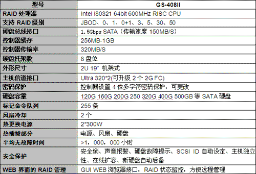 高性能:GS-408II采用业界标准Intel i80321 64位RISC专用I/O处理器,满足大容量数据传输、高带宽和I/O处理能力的高要求。