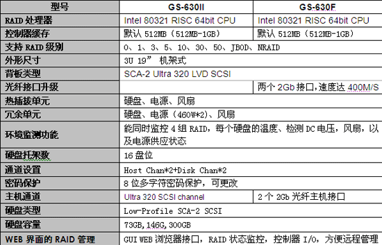 高性能:GS-630II系列采用业界标准Intel 80321 64位RISC专用I/O处理器,标配512MB ECC Cache,特别适用于数据库、网络流媒体等高I/O及高数据传输要求的应用。