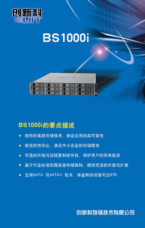 UIT新推出的BS1000i磁盘阵列在标准的IP网络上提供了一种全面的存储解决方案. BS1000i基于标准的硬件平台和强大的SAN(存储区域网)管理软件. 标准的硬件架构, 易用的存储管理软件, 独特的快照和远程复制技术,不仅提供了系统的高可用性、高可靠性与灵活的扩展, 还使备份与容灾的部署更加简易。
