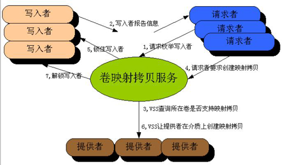 VSS能够让存储基础设备(比如磁盘、阵列)创建高保真的时间点映像,就是映射拷贝(Shadow Copy)。它可以在多卷、或者单个卷上创建映射拷贝,同时不会影响到系统性能。VSS通过协调业务应用软件、备份程序,以及存储硬件,从而达到创建高保真映射拷贝的能力。它可以应用到以下领域: