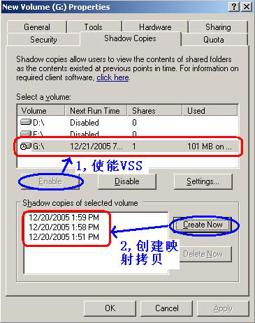 目前,在WS 2003 SP1或者某些测试版Vista上,直接有VSS模块。以下是笔者在一台名为VSS-SERVER的服务器(装WS2003)上,配置G盘的VSS。先在“我的电脑”->“G盘”->“属性”,选择“Shadow Copies” Tab页,将弹出下图所示的对话框: