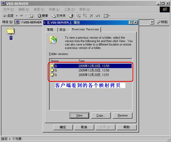 安装完毕后,在客户端访问\VSS-SERVER服务器,就可以看到设置了VSS的共享G盘,然后选择“G盘”->“属性”,选择“Previous Versions”TAB页,就可以查看和管理映射拷贝了,其显示效果如下图所示: