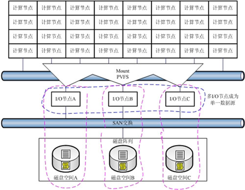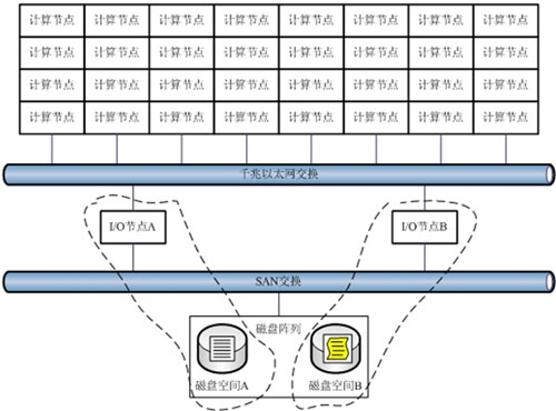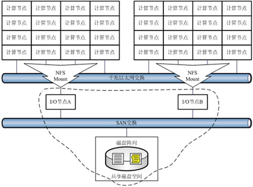在这一架构下,各个计算节点形式上还是通过NFS共享访问I/O节点,但实际的数据读写路径则通过SAN交换直接到达磁盘阵列。这种模式的可行性已经在现实中被证实。例如,IBM公司的GPFS技术就是以这种方式解决集群的I/O瓶颈问题的。