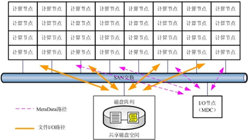 目前SAN架构下文件共享的技术已经较为成熟,如果将全部计算节点都接入SAN,而将I/O节点设置为MDC(Meta Data Controller),就可以在提高系统I/O能力的同时,形式上保留原有的单一I/O节点,单一数据源的逻辑结构。