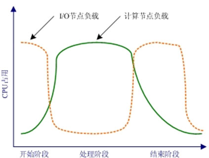 当一个计算任务被加载到集群系统时,各个计算节点首先从I/O节点获取数据,然后进行计算,最后再将计算结果写入I/O节点。在这个过程中,计算的开始阶段和结束阶段I/O节点的负载非常大,而在计算处理过程中,却几乎没有任何负载。
