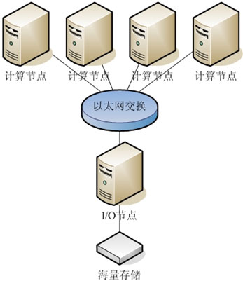 Linux并行集群中的计算资源按其功能角色不同,通常被分为两种:“计算节点”和“I/O节点”。其中计算节点负责运行计算任务,I/O节点负责数据的存储并响应计算节点的存储请求。目前Linux并行集群一般采用单I/O节点服务多计算节点的模式。从硬件角度看,I/O节点和计算节点都是标准的IA架构,没有本质区别。计算所需要的初始数据、计算得出的最终数据以及并行计算平台本身,都存储于I/O节点上。计算节点与I/O节点间一般采用标准NFS协议交换数据。