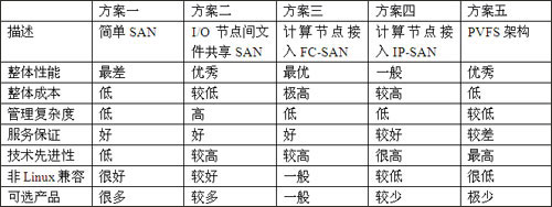 综上所述,笔者认为上述方案各有优势,但问题也同样明显。如果用户可以接受管理维护的复杂性,那么方案二似乎最为经济实惠。如果用户愿意接受基于GPL无原厂商服务支持的自由产品,并在短期内不考虑对非Linux集群系统的整合问题,则可以采用PVFS技术,即采用方案五。方案三虽然是所有方案中性能最好的,但其高昂的成本显然不是每一个用户都愿意接受的。