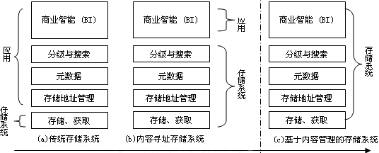 然而,不管如何,Centera内容寻址存储系统将一些内容管理功能如元数据技术和高速索引技术集成到存储系统之中,它启动了网络存储与内容管理结合的新纪元(图2b);未来,更多的内容技术将与存储系统实现结合,原本存在于内容管理系统、数据仓储、存储系统之间的界限将日益变得模糊,提供所有这些服务的统一视图的平台将会出现。