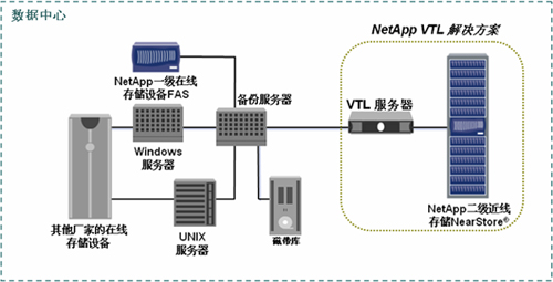 在传统型磁盘备份恢复的模型里,近线存储前无需增加VTL服务器,近线存储本身就可以充当备份的目的设备。这主要是要求备份软件可以支持把数据目的设备配置成一个文件或目录,以普通文件的方式来记录备份的影像;而不是一个流式文件,必须把数据目的设备配置成流式磁带机。现在绝大部分的备份软件都支持这样的配置。