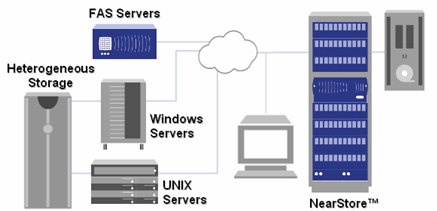 NetApp的先进型磁盘备份恢复解决方案中一级存储可以分为NetApp产品和非NetApp产品两种,二级存储采用NetApp的产品。在这里需要指出的是,NetApp产品包括采用FC磁盘的FAS存储和采用SATA磁盘的NearStore存储。两者的管理和应用是一致的。
