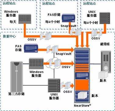 3、 可以实现远程集中备份:由于传递的是有效改动的数据块增量,因此对链路的需求不大,利用先进型磁盘备份恢复可以把多个远程站点的数据集中备份到数据中心,在进行磁带备份,这样可以降低远程站点的维护人员的素质要求,优化企业的系统架构,降低整体拥有成本。远程集中备份需要注意的技术难点除了备份外,更重要的是恢复,对此NetApp有完整的解决方案。