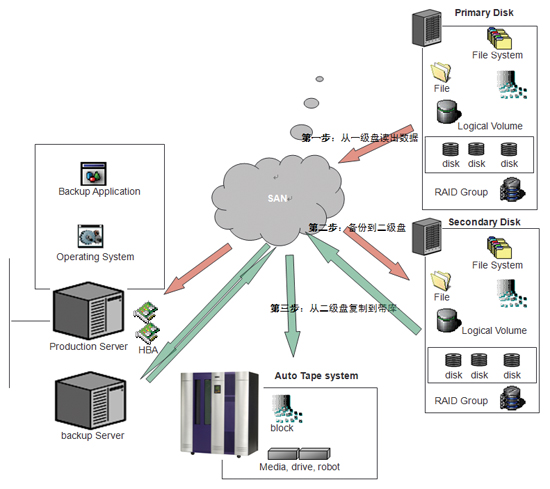 由于用户的IT需求在不断发展,备份窗口(时间)也在不断缩减,于是D2D2T (磁盘到磁盘到磁带)的备份方式应运而生。通过D2D2T的备份方式,数据将经由FC磁盘先以磁盘镜像的形式备份到ATA盘,以提高运行效率,有效地缩短备份窗口(时间),待备份窗口关闭后再由ATA盘自动将资料复制到自动磁带库上。通过建立这样一个存储流程,不但可以实现较高的备份效率,在恢复时还具有更好的灵活性,比如根据运行速度或恢复时间限制,从磁盘或磁带恢复数据。