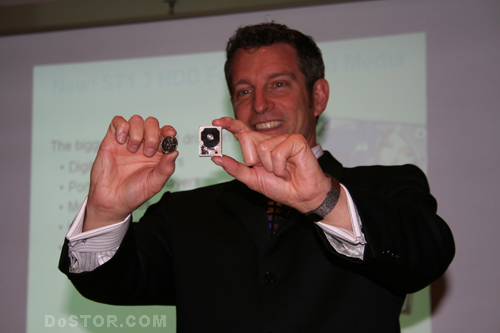 存储在线 3月3日北京消息:希捷科技今天在北京宣布推出ST1.3系列12GB 1英寸硬盘,为其种类繁多的消费电子产品线增添了新成员。希捷科技全球消费电子营销总监Rob Pait亲临北京,向众多媒体介绍新产品特性。Rob介绍说,“与希捷目前的1英寸硬盘相比,ST1.3系列硬盘体积缩小了23%,存储容量提高了50%,功耗降低了30%,并配备可选择的跌落传感器以提高坚固性,为手持设备制造商提供了所需的特性。同时,ST1.3系列硬盘也是希捷公司首款采用垂直记录技术的1英寸硬盘。”