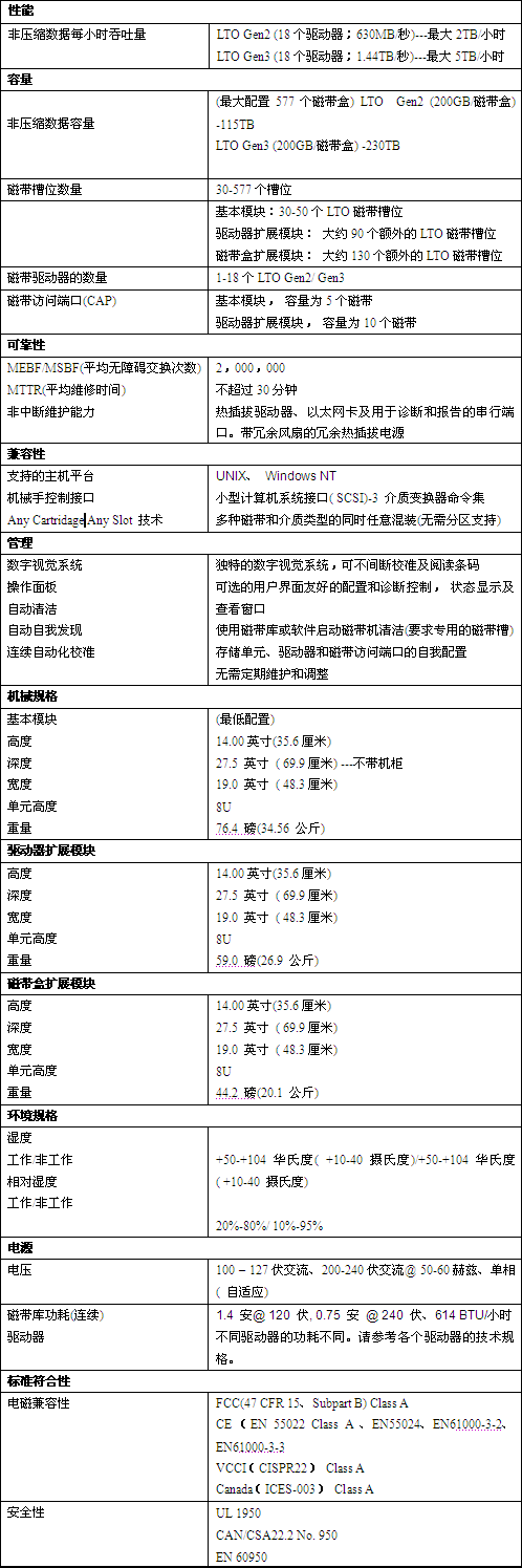 机架式安装方案盒密集的磁带盒槽位设计使SL500模块化磁带库系统十分适合空间宝贵的环境。您可以配置一个独立的磁带自动化机架,也可以将SL500与服务器和磁盘存储阵列结合配置在一个机架中。