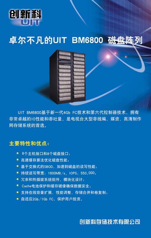 UIT BM6800基于新一代4Gb/s光纤通道技术,采用第六代企业级控制器,每个控制器内置一块高性能XOR处理芯片和一块数据传输芯片,从而拥有高IOPS和高带宽性能,非常适用于OLTP和高带宽应用系统。其业界领先的IO性能加快了在线事务处理的能力,缩短了庞大数据的装载时间并且支持庞大的数据合并和减少了数据复制时间。同时其卓越的带宽性能使其成为广电行业的大型非线性编辑制作和媒资系统,以及高清节目编辑制作网SAN存储系统的首选。BM6800可自动兼容目前的2Gb/s和过去1Gb/s的光纤通道链路,保护了用户的原有投资。