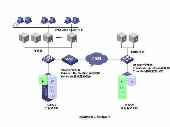 容灾中心采用了1台华为3Com公司的IX1000存储系统,每台IX1000内置了1套NeoStor虚拟化数据管理系统专业版。