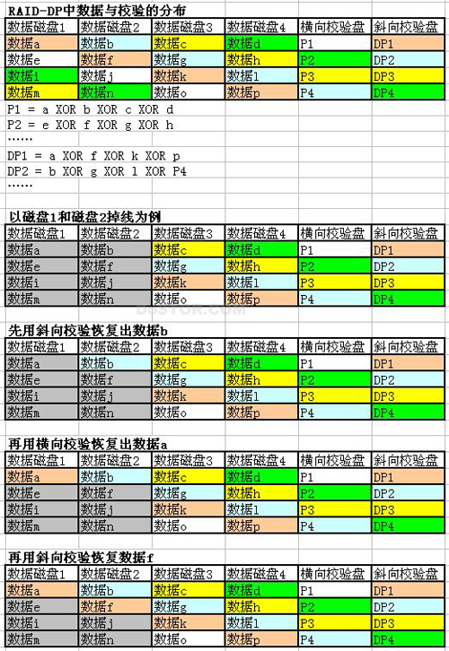 网友Billylee提供的Intel讲义中就提到一种Dual-XOR算法,这种方法就是取横向和斜向两个方向进行XOR运算,这样每个应用数据都在两个校验中留下痕迹,当两颗磁盘掉线时,就可以恢复数据。