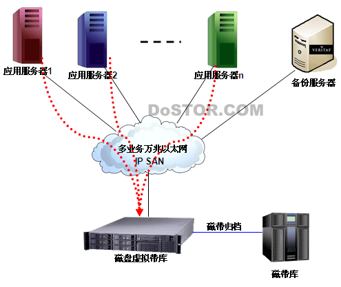 在原有的万兆以太网络上实施IP SAN网络,将低效的网络备份转化成高效的SAN备份,在备份软件的协同工作下备份数据直接通过万兆网络备份到虚拟带库,再从虚拟带库输出到物理磁带库进行必要数据的归档。