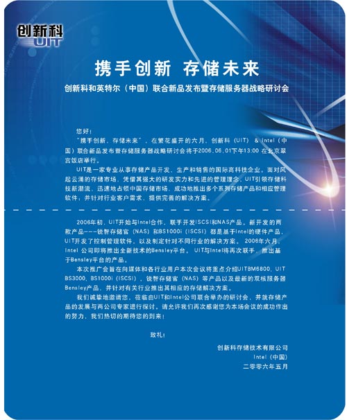 2006年初,UIT开始与Intel合作,联手开发ISCSI和NAS产品。新开发的两款产品—-锐智存储官(NAS)和BS1000i(ISCSI)都是基于Intel的硬件产品,UIT开发了控制管理软件,以及制定针对不同行业的解决方案。 2006年六月, Intel 公司即将推出全新技术的Bensley平台。 UIT与Intel将再次联手,推出基于Bensley平台的产品。 本次推广会旨在向媒体和各行业用户本次会议将重点介绍UITBM6800,UIT BS3000,BS1000i(ISCSI),锐智存储官(NAS)等产品以及最新的双核服务器Bensley产品,并针对有关行业推出其相应的存储解决方案。