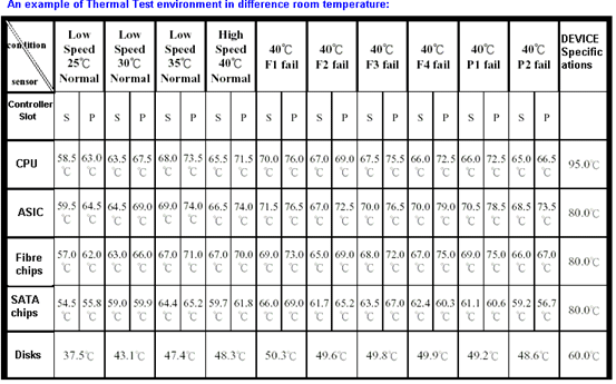 温度测试的条件是以周围环境的高或低温变化如下图样品,来进行磁盘阵列系统内部各个发热零部件的温度测试.由实际测试所得到的结果我们才能证明进气风向是否顺利引导到热源区域,再将热能排出 .举例来说,CPU、集成电路芯片或硬盘等是达到最佳散热效率,并保证维持在正常工作温度范围以内