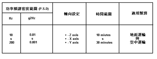 振动试验条件有包含设计阶段的正弦波(Sine Wave)测试,或随机波(Random Wave)测试,它以不同的测试频率,时间设定,依其类别做各个轴向振动试验,下图举其中一种随机波的振动试验条件.