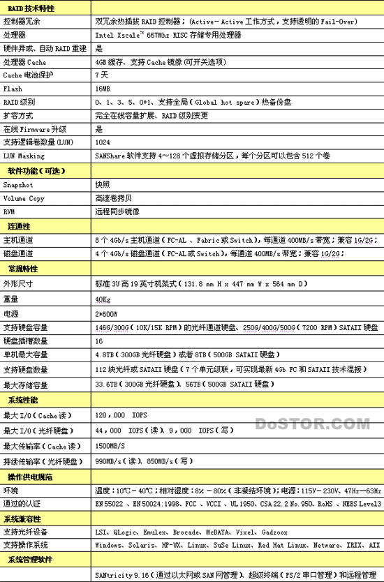 光纤通道4G产品。采用Intel Xscale 架构667MHz RISC处理器,完全硬件XOR校验。最大支持4GB缓存。提供8个主机端口(1Gb/2Gb/4Gb自适应),数据传输率1500MB/s,I/O事务处理可达到120,000 IOPS。
