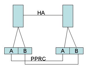 3、双机双柜(os层镜像)方案,这个方案,仍然是用os层做镜像,但是用了双机ha,这种方式有个尚未确认的风险,非纯软方式的ha要求主机有共享的存储系统。一台机器对盘阵lun做的镜像虚拟卷,是否也适用另一台主机,也就是说,a主机做的镜像,b主机接管后,是否会透明的认出a机做镜像之后的逻辑虚拟卷,如果ab两主机互相都能认,那么就是成功的方案!!