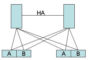 5、双机双柜纯软方式HA。这种方案,主机装纯软HA软件,虽然纯软不需要外接盘阵,但是接了盘阵,照样可行。