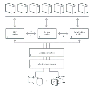 首先是CDP(Continuous Data Protection,连续数据保护)服务,以SLA恢复点和恢复时间为基础产生和管理“时点拷贝”,确保动态数据的连续可用性。第二,归档服务(Archive Services)提供一个基于策略管理的对象存储库,以满足参考信息和依从性的要求。对象可以直接从对象存储库被吸收进入主数据,或者从CDP管理的时点拷贝中提取出来。最后,虚拟服务(Virtualization Services)也必不可少,在ILM系统之中发挥作用,直接服务于业务应用。