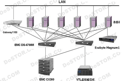 SAN+NAS集成解决方案就是在统一的SAN架构下,添加NAS网关,NAS网关和其他主要业务系统主机共享统一SAN架构下的存储资源,从而实现在满足主要业务系统的高性能、高可靠数据访问需求的同时,通过添加的NAS网关兼顾大量边缘业务系统对存储资源的需求,实现真正的存储信息整合。