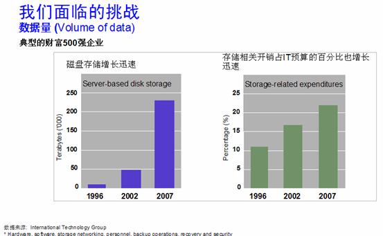 存储数据量飞速增长和存储开销在IT投资比例的飞速增长。