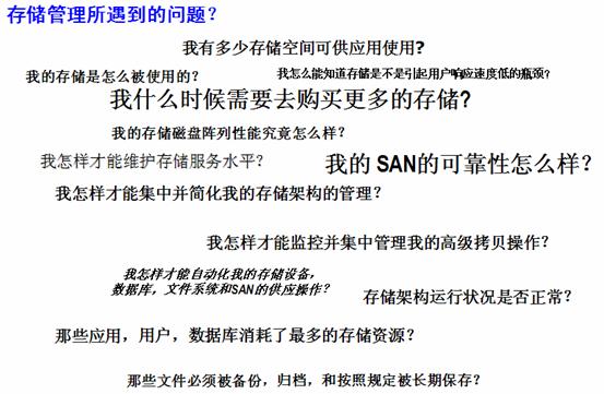 Gartner Group与Meta Group分析师已证实存储方面CIO和IT管理员最为关注的几大问题分别是,存储的系统总体成本(TCO),存储复杂性(包括扩容和更新灾难恢复计划),以及管理错误和成本。