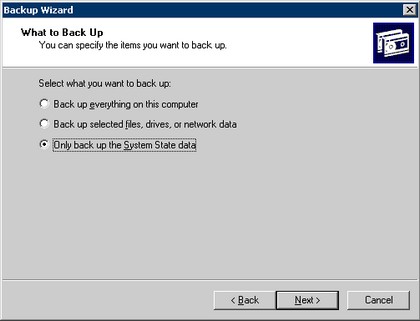 首先介绍活动目录的备份。正如你所了解的,如果你备份域控制器的系统状态数据,那么活动目录也得到备份。(系统状态数据包括活动目录数据库,系统启动文件,SYSVOL, 注册表以及其他一些文件,服务器所扮演的角色决定系统状态数据的内容。)正如你在图A和图B中所看到的,对系统状态数据的备份是直接的。