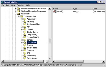 - 进入HKEY_LOCAL_MACHINESOFTWAREMicrosoftWindows NTCurrentVersionDNS Server (图C)。