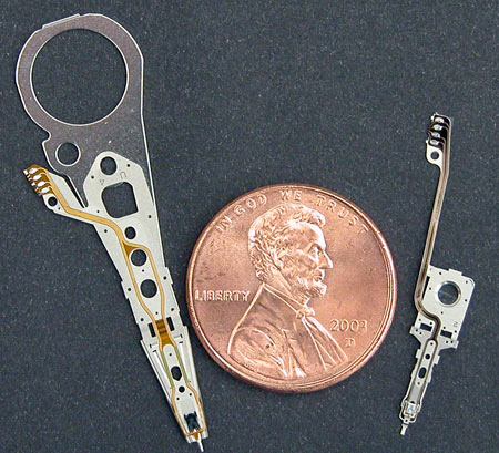 左侧的皮米滑橇(pico slider)和飞米滑橇(femto slider)。滑橇位于磁头臂的前端。2003年问世的飞米滑橇尺寸更小,能够减小硬盘的能耗,提高硬盘的性能。