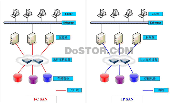 以光纤搭建的存储网络是FC SAN,以iSCSI技术搭建的存储网络叫做IP SAN。