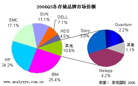 本季度IBM以25.4%的市场份额排市场价值的首位,HP、EMC分别以24.2%、17.1%的份额排在第二、三位。