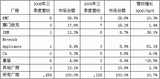 存储复制是最大的软件存储市场之一,2006年三季度比去年同期增长了22.5%。同时存档和分层存储管理(HSM)是比较小但快速增长的细分市场,和去年同期相比增长30.8%。