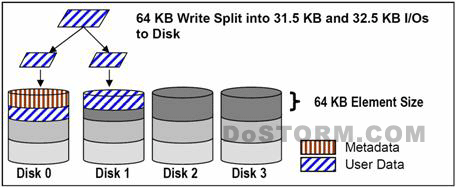 一个通常的例子如下图所示。基于intel架构的系统是不对齐的,这是因为元数据(Metadata)是被BIOS所写的。在一个对齐的系统,64KB的写操作会由单独一个硬盘来服务。
