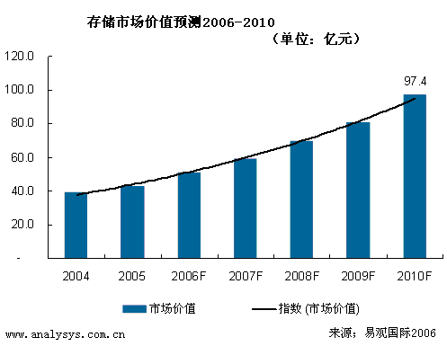 存储在线 12月26日北京消息:易观国际《中国存储市场趋势预测2006-2010》研究表明,2010年中国存储市场总市场价值将达到97.4亿元,从2006年到2010年的销量年均复合增长率为17.9%。