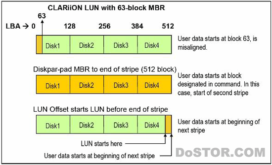 当没有基于主机的程序在使用的时候,我们可以使用LUN对齐位移的方式。LUN对齐位移方法对一些复制的软件操作,如clone sync I/O, SnapView Copy On Write opertions, MirrowView sync I/O, SAN Copy I/O等,造成磁盘和strip跨盘的问题。