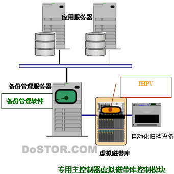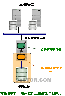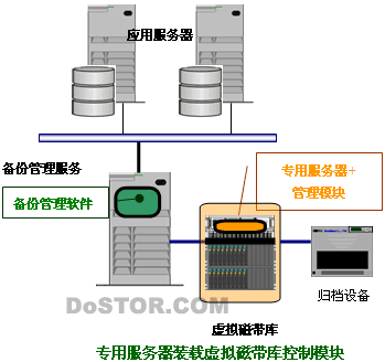 该方案实际上是另外一种虚拟磁带库的软件实现方案:通过把虚拟磁带库管理软件安装在一台独立的专用服务器(一般是PC服务器)内,而将该服务器及所连接的磁盘存储设备模拟成磁带库。