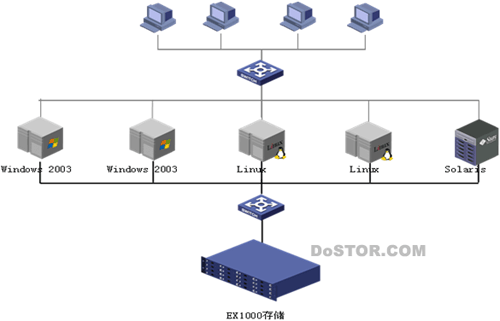 所有需要连接Neocean EX1000的服务器,如数据库服务器、邮件服务器等,只要安装千兆网卡,并安装iSCSI Initiator软件,就可以通过以太网接入存储设备,而不需要购置价格昂贵的HBA卡。Neocean EX1000支持的操作系统:Linux、Windows、Solaris,都支持这种千兆网卡加软件的iSCSI Initiator的实现方式。