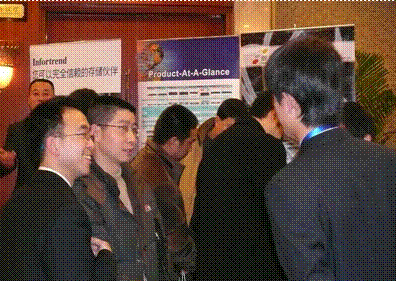 针对目前大家较为关注的“网络化监控”这一热点议题, 银兴科技结合其多年来在视频监控方面的经验,并综合了目前使用者的大致情况, 提出了一系列切实可行的存储解决方案,并对方案进行了详细的阐述。中场休息时,众多参会者放弃休息时间,围在银兴科技的现场产品演示台前,与银兴科技的工作人员进行进一步深入的交流与沟通,向银兴科技工作人员询问关于 Infortrend 及银兴的公司背影,以及 EonStor 品牌磁盘阵列的性能。并表达了对 EonStor磁盘阵列产品的强烈需求。
