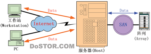 当服务器向SAN存储网络中的阵列发送Block请求时,数据就会通过存储网络导向器(Director)或者交换机(Switch)传递,并最终到达存储阵列(Array)。