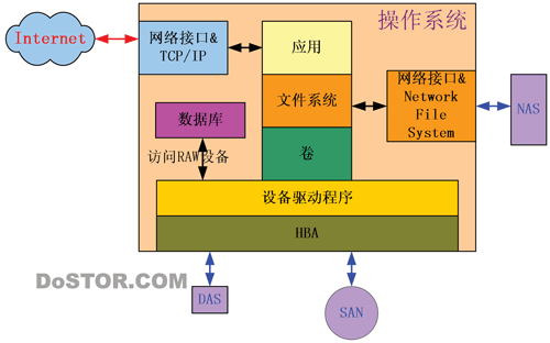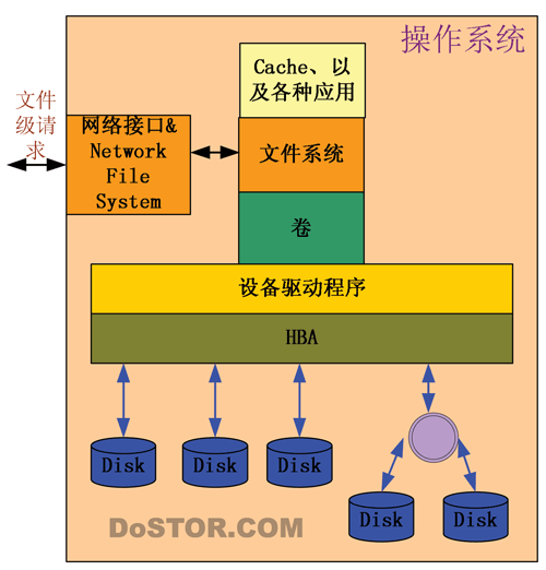 同样,NAS也有操作系统,比如一些定制的UNIX系统或者裁减的Linux系统,甚至采用Windows操作系统;只不过,这些操作系统都针对NAS应用做了相关的改动,将一些不需要的功能去掉,同时增强在存储和网络方面的功能。因此,和服务器内数据流动类似,也要经过文件系统、卷管理,以及HBA和其驱动。但是,在高端为了提高可靠性,在每个模块都加入了相关的功能,来避免出现单点故障,同时由于是针对存储的应用,所以管理的磁盘比较多,通常采用了RAID技术来提高数据存储的安全性。