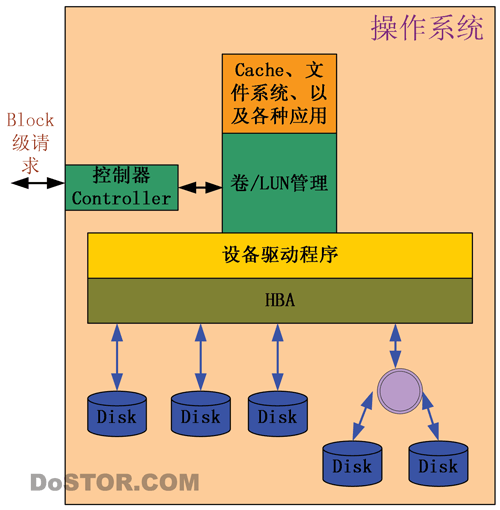 比起NAS,SAN环境中的阵列多应用在高端,所以更显其高贵血统。从而,对于普通用户来说,神秘的面纱更是像千层饼一样,剥了一层又一层。其实,和NAS类似,阵列一样也是专门为存储设计的服务系统,它们之间最大的差别就是,阵列提供给外面的是基于控制器的Block请求,而NAS则是基于文件系统的请求。